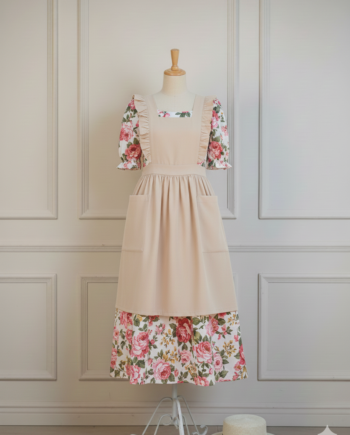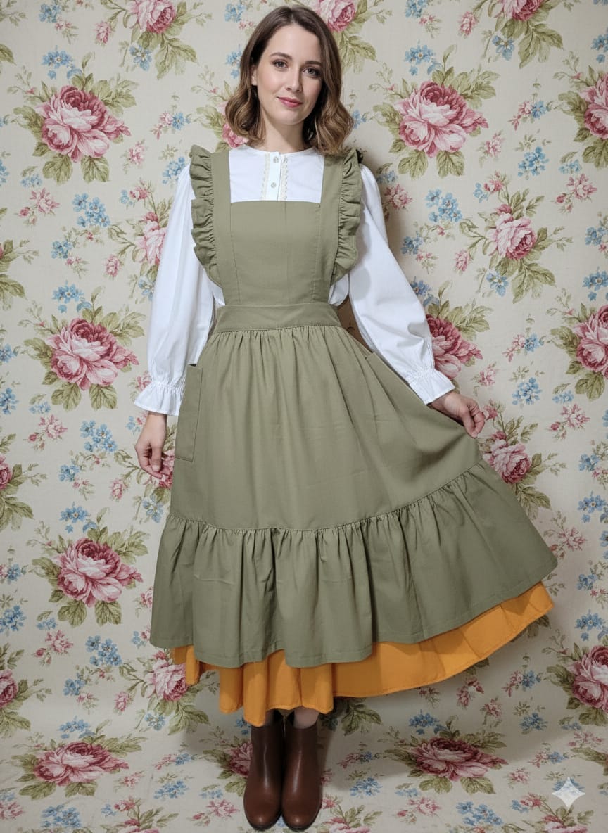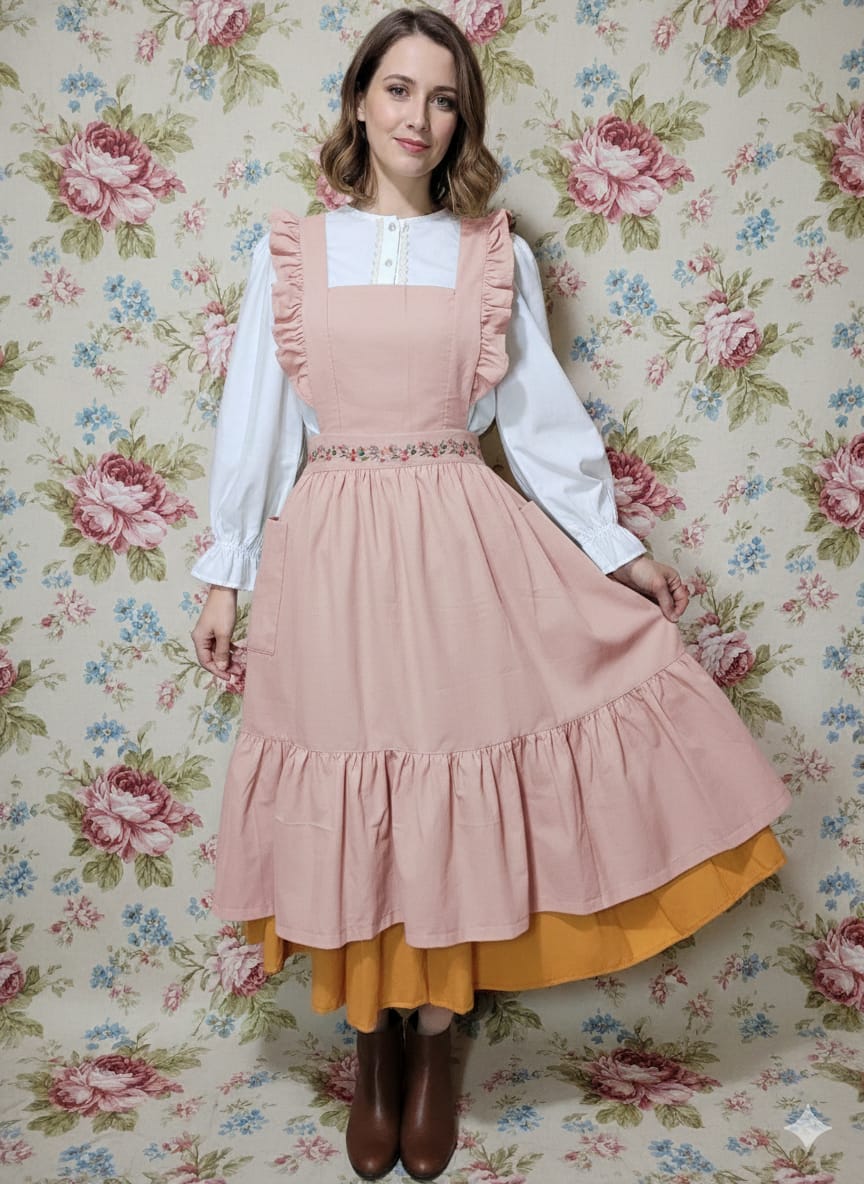 Modelo tradicional camponesa, com alças de babados, dois bolsos e babado na saia. Comprimento da saia de 63cm. As alças se amarram no cós traseiro.