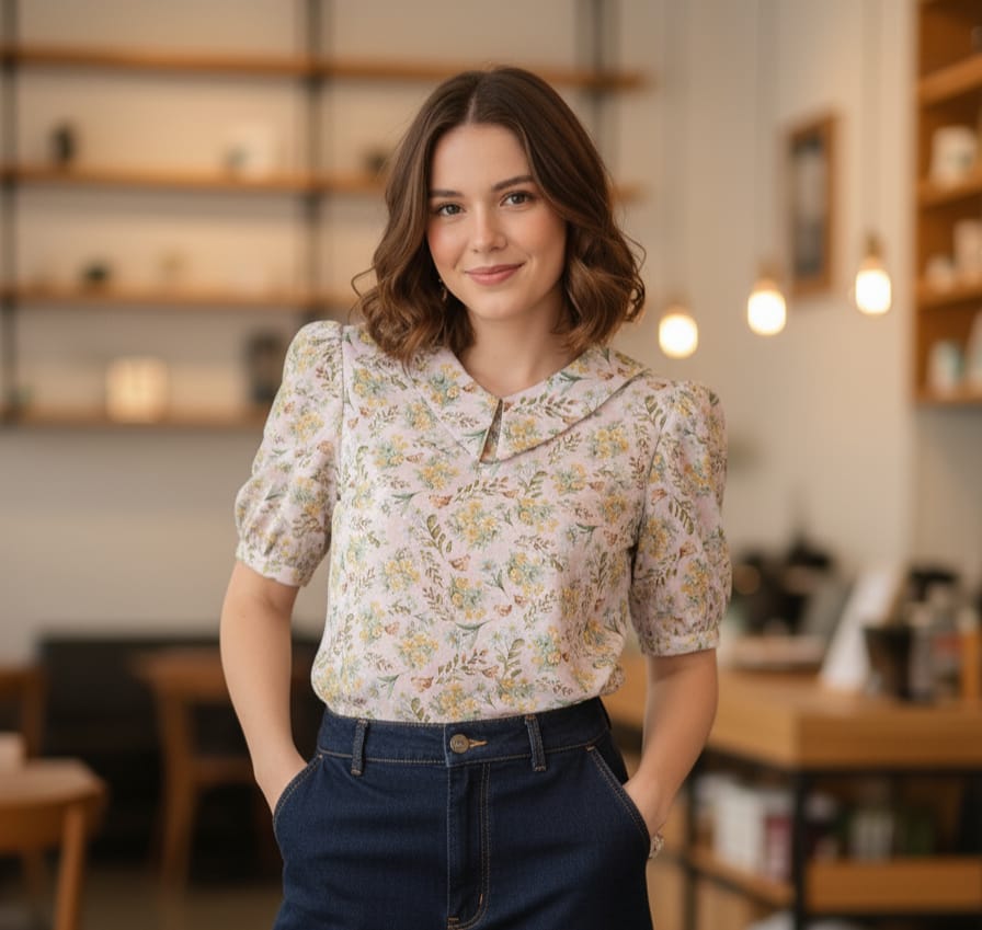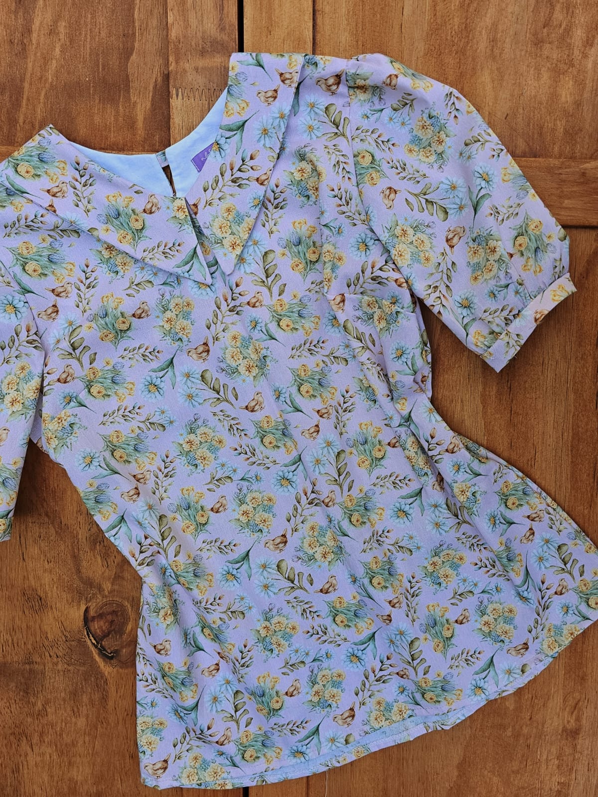 Charmosa blusa com gola chelsea, modelo com manguinhas levemente bufantes, com punho, estampa digital com passarinhos, fundo rosa claro. Tamanho M, peça única.