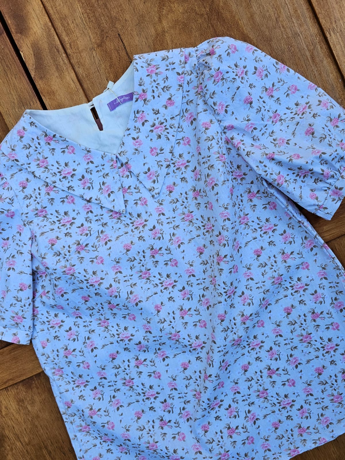 Descrição Charmosa blusa com gola chelsea, modelo com manguinhas levemente bufantes, com punho, estampa floral suave, fundo of white. Tamanho P , peça única.