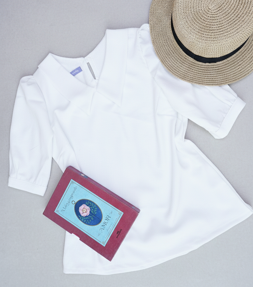 Blusa com charmosa gola retrô em ponta . Mangas levemente bufantes.
