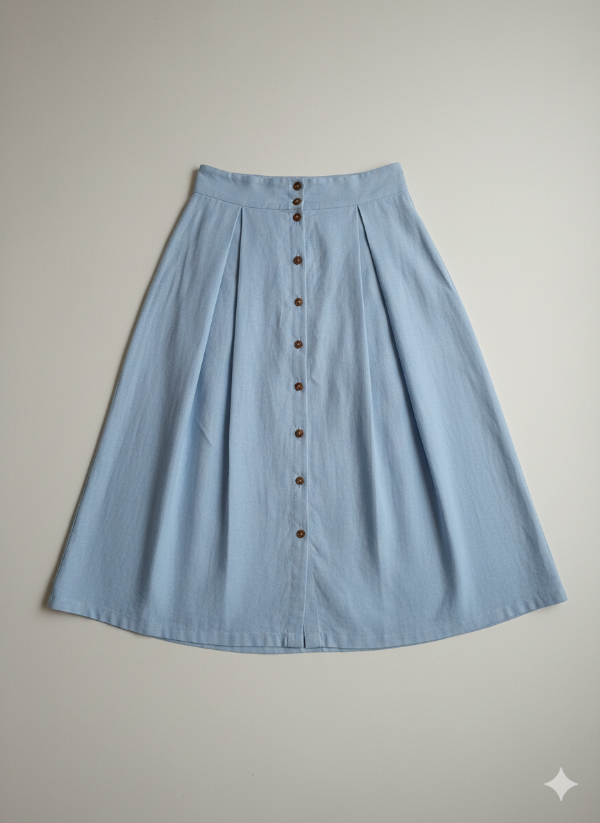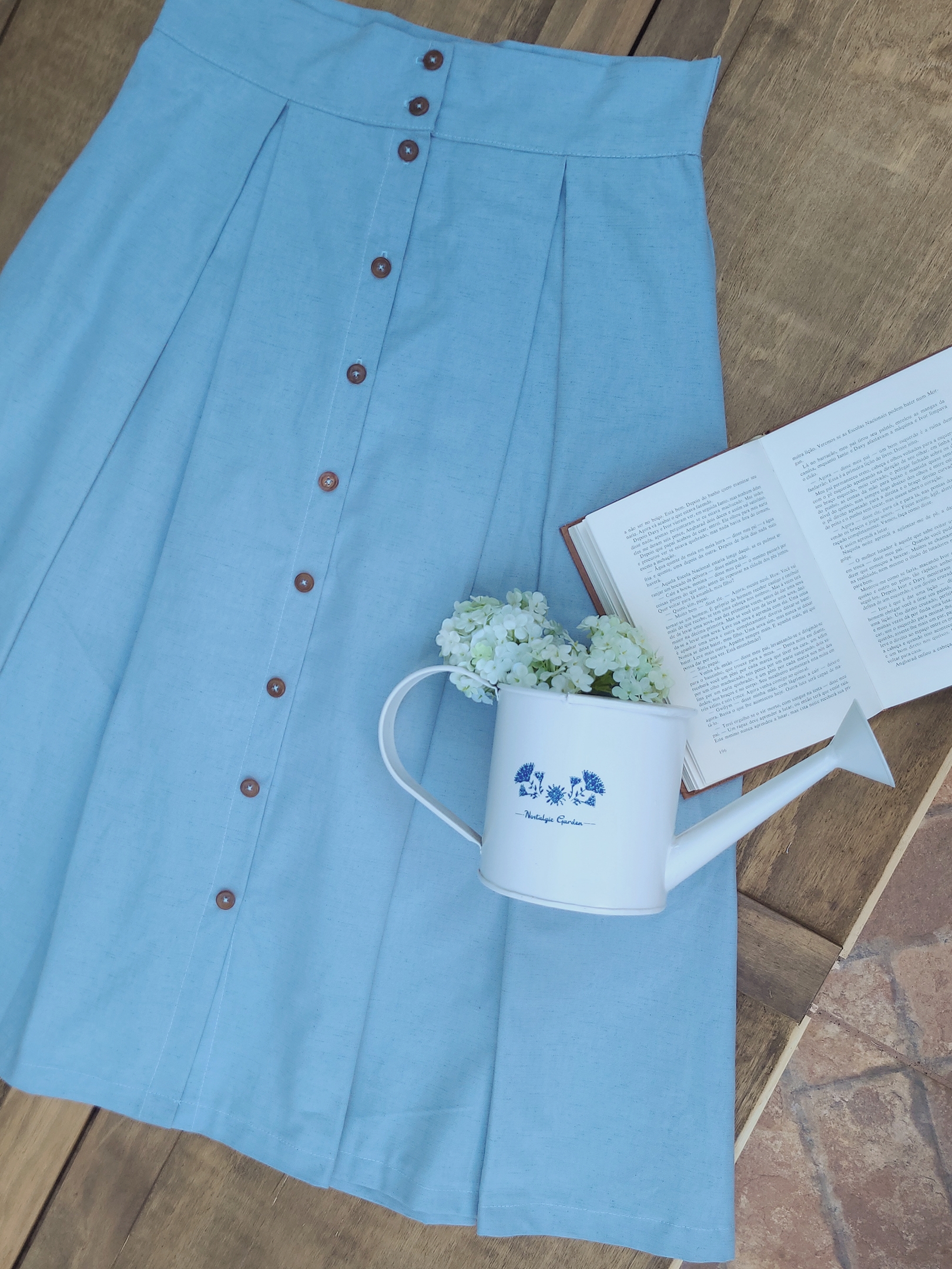 Saia com pregas e botões frontais. Elegante que veste bem vários tipos de corpo, acinturando na medida pelo seu formato em A. Com bolsos internos e botões frontais. Cós reto. Comprimento de 70cm. Usamos linho ou liocel marrant, deseja uma cor específica? Nos informe que poderemos verificar a possibilidade .