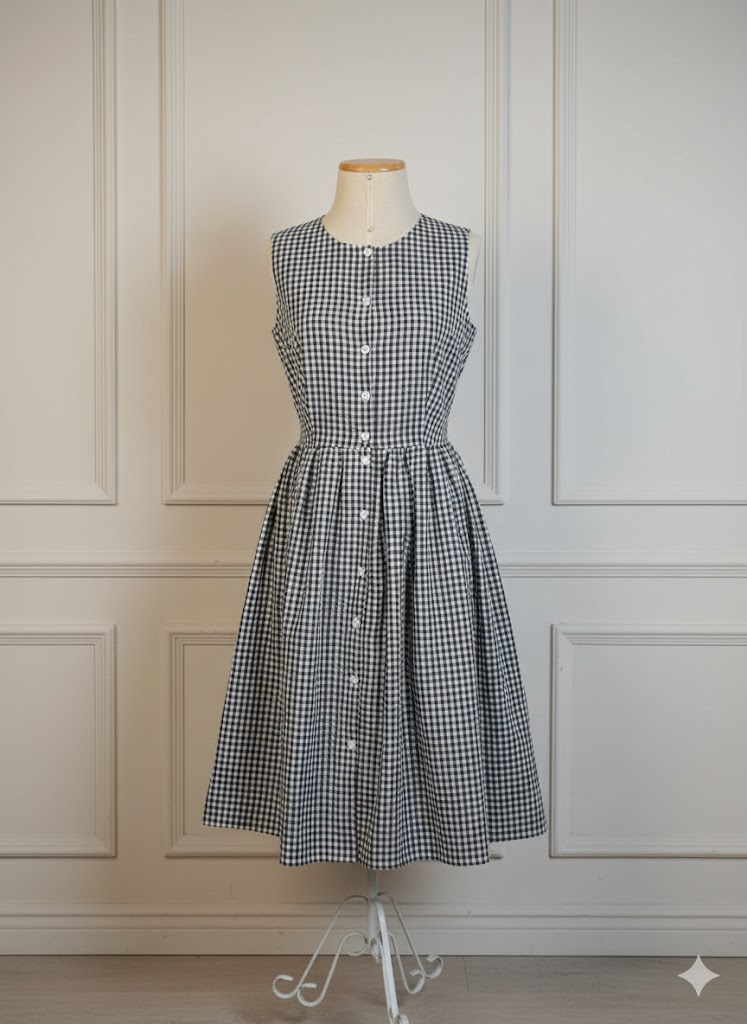 Vestido de abotoamento frontal, costas soltinhas sem mangas e saia franzida. Faixa que dá laço nas costas.