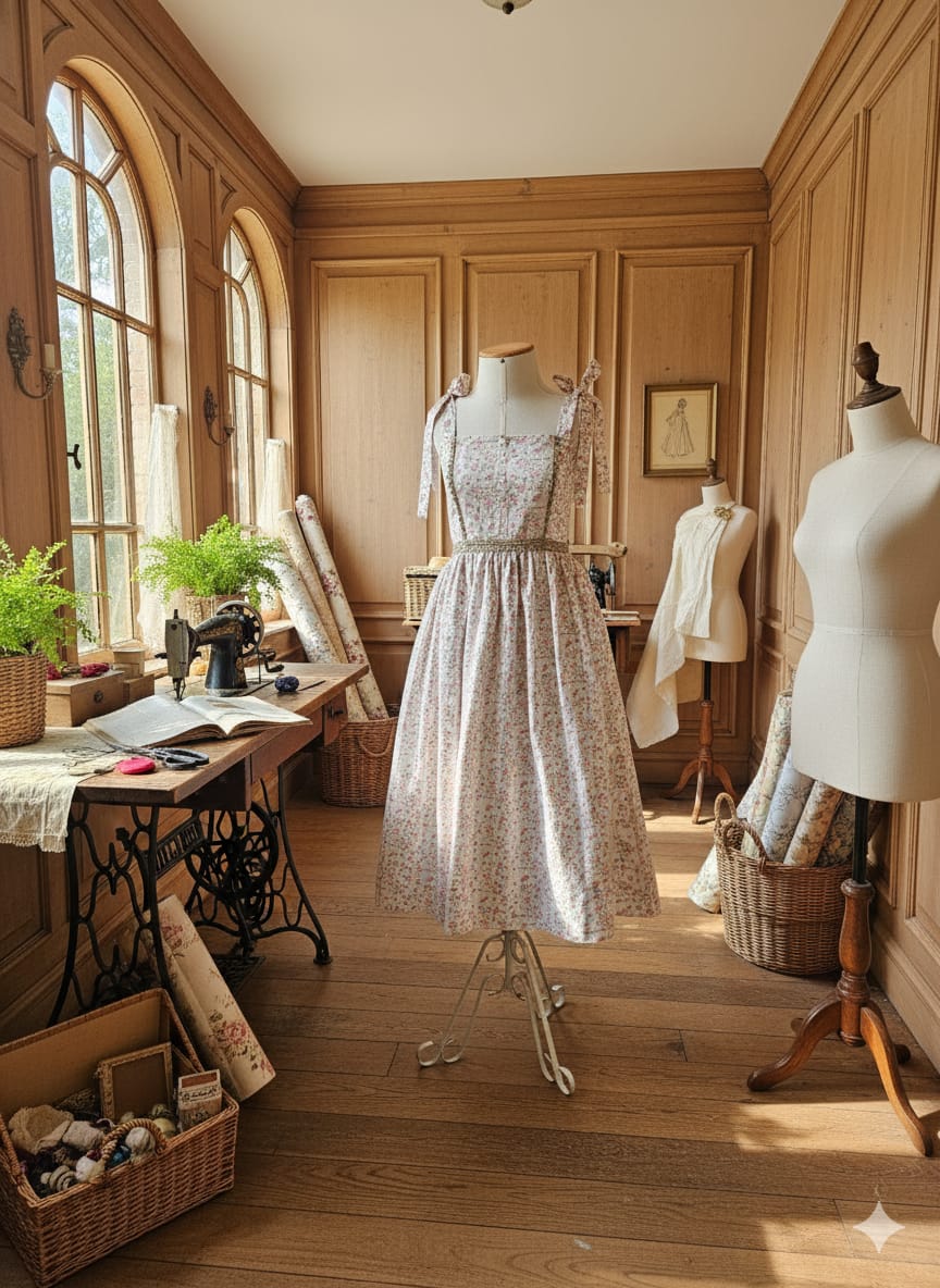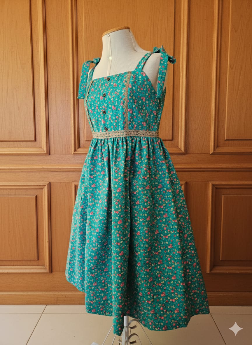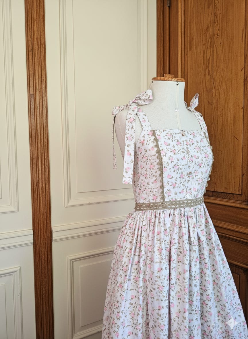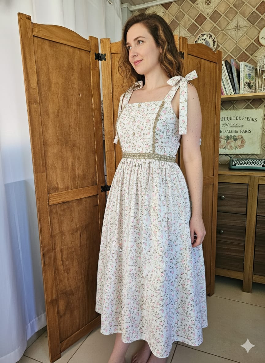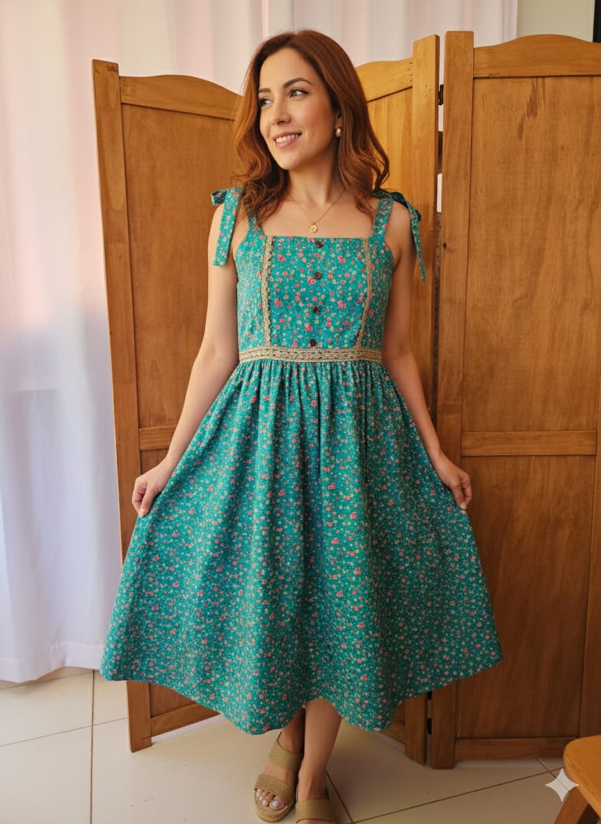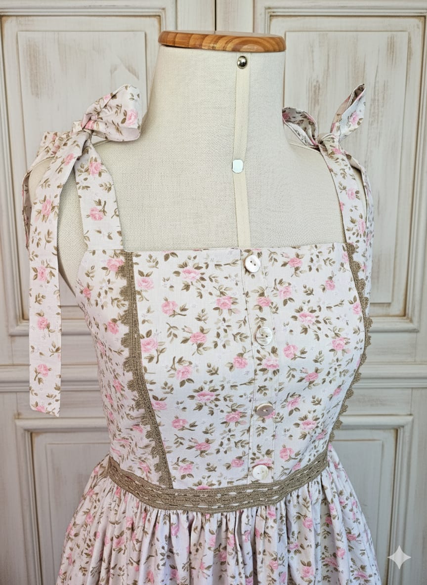 Vestido com alças que se amarram com laço no ombro. Com recortes contornados por renda na parte da frente. Toda a cintura contornada por renda. A parte superior do vestido é dupla (forrada) .Feito em algodão 100%, saia franzida , bolsos e zíper nas costas. Os botões são decorativos.