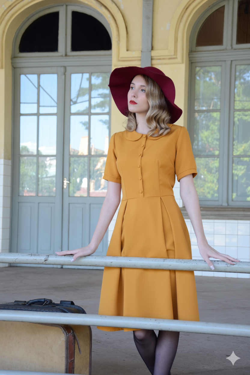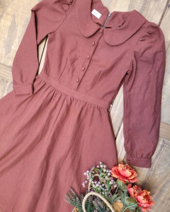 Esta versão do Vestido Elizabeth possui a saia com modelo de pregas. Mangas bufantes com punho e botões frontais funcionais decorativos. Possui bolsos também. Comprimento da saia de 70 a 75cm.