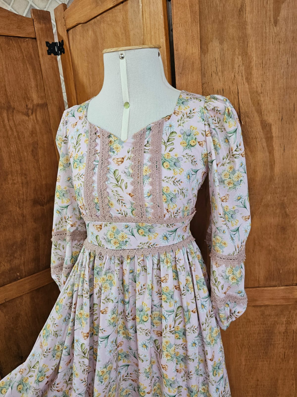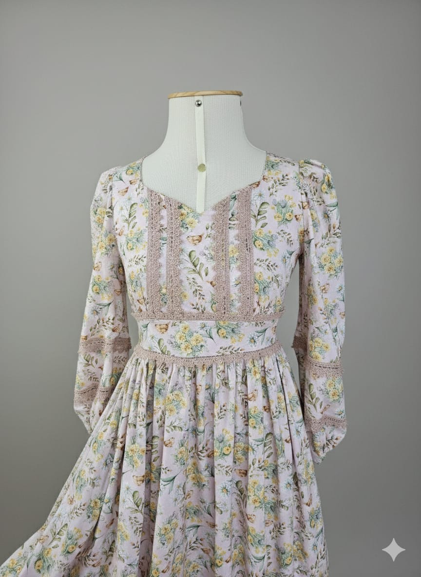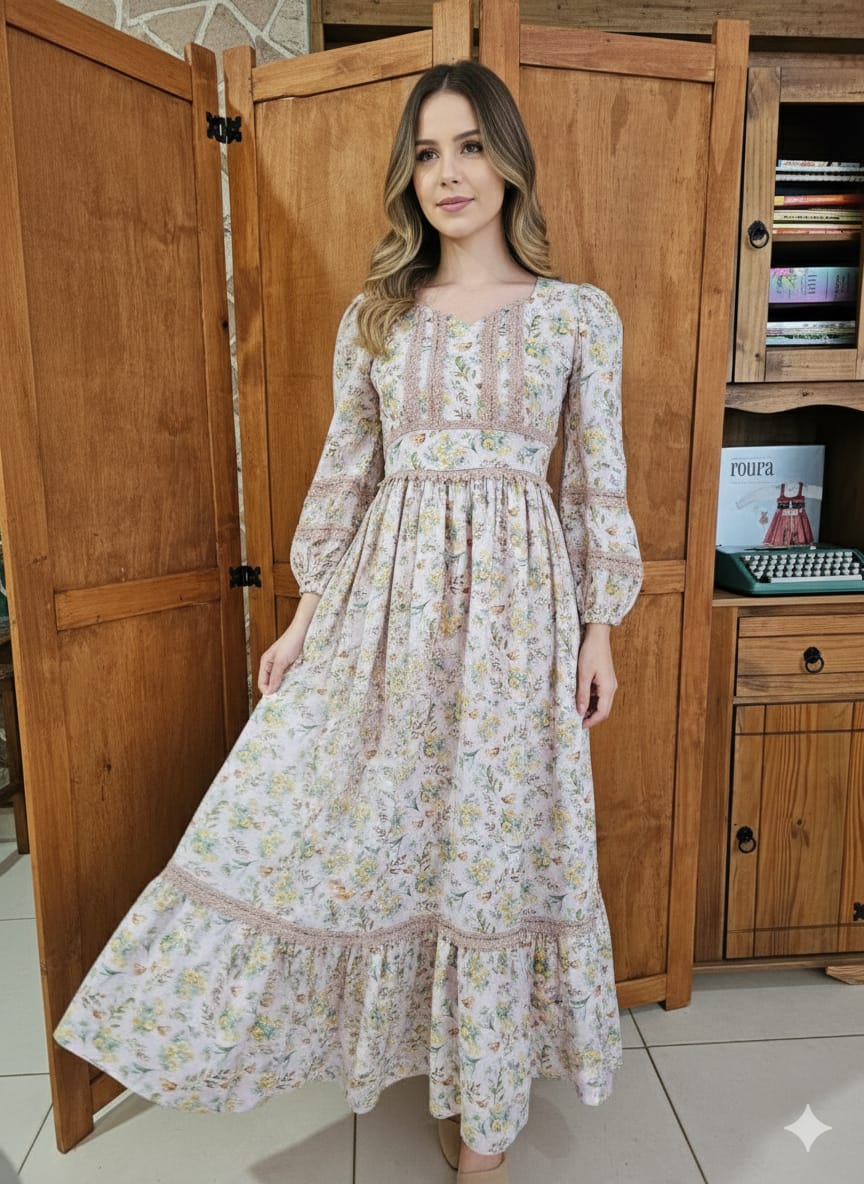 Inspirado na marca Gunne Sax , esse modelo rico em detalhes fará você brilhar ao usar. Decote coração, rendas na cintura, no peito, nas mangas e na saia, fazem esse vestido ser único e precioso. Manga longa, saia com 90cm.