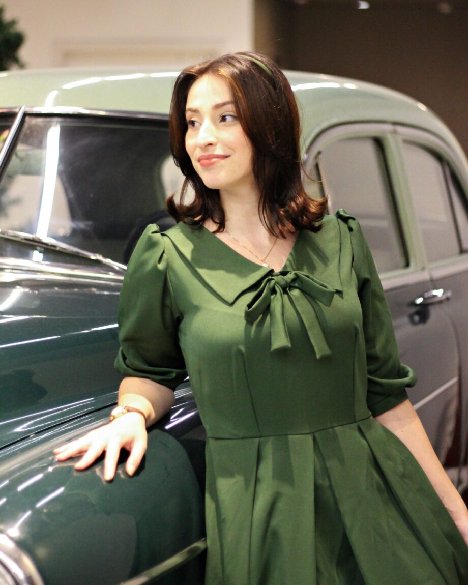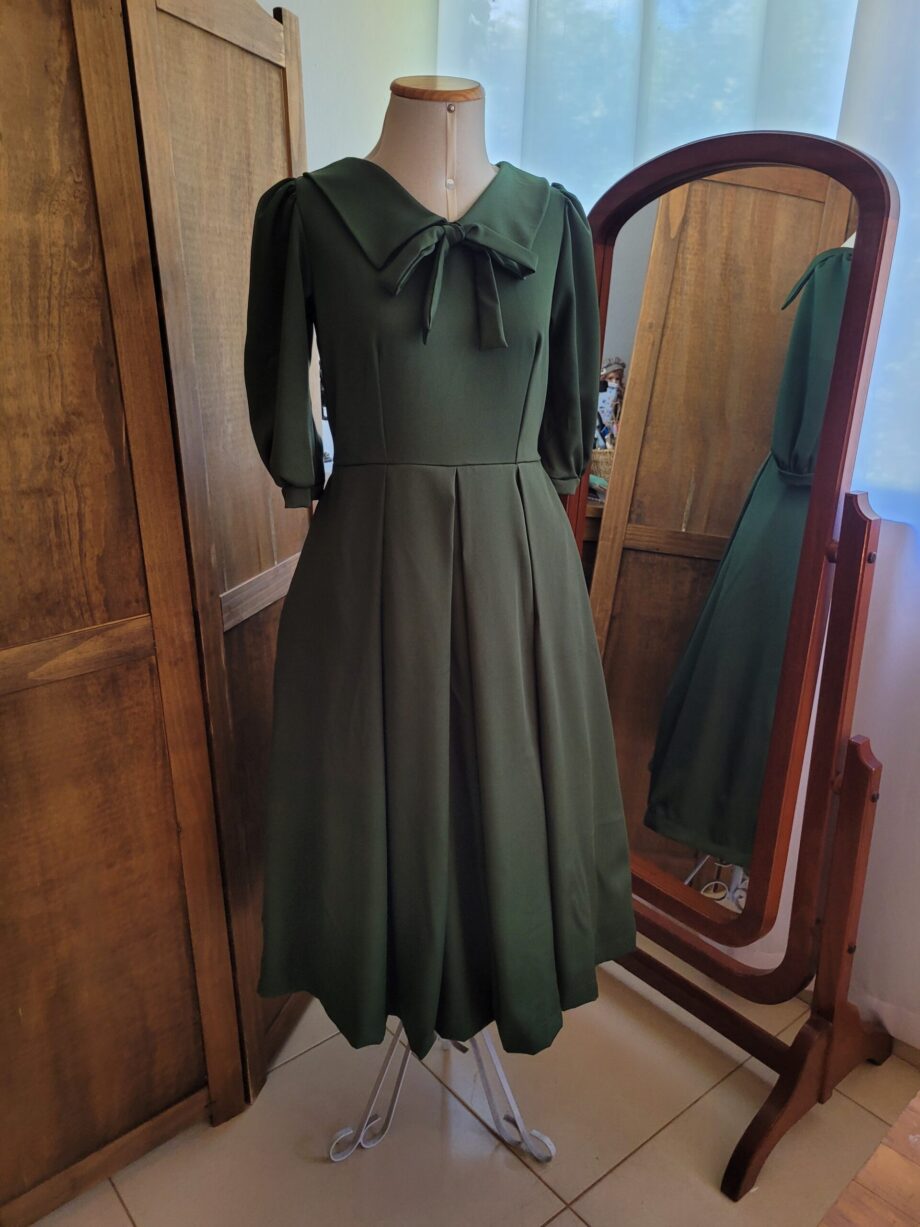 Vestido retrô de pregas e gola vintage elegante com inspiração nos anos 40.