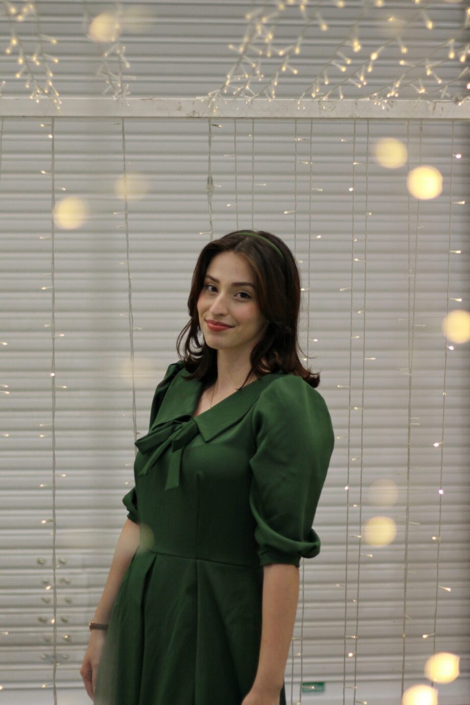 Modelo com gola charmosa em ponta, feito no linho misto verde.